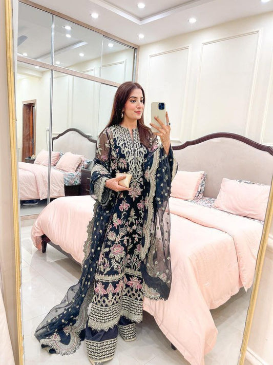 Beautiful Pure Georgette Embroidery Siqunce Thread Work Top - Sharara & Duppta Set.