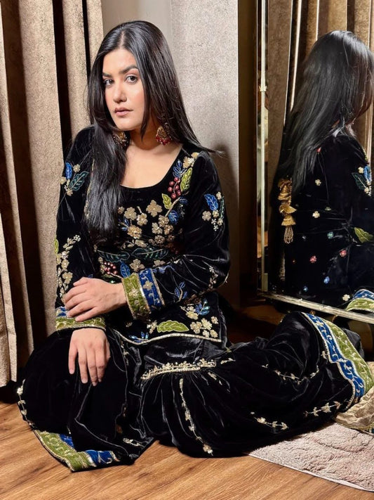 Beautiful Pure Velvet Embroidery Thread Work Top - Sharara & Duppta Set.